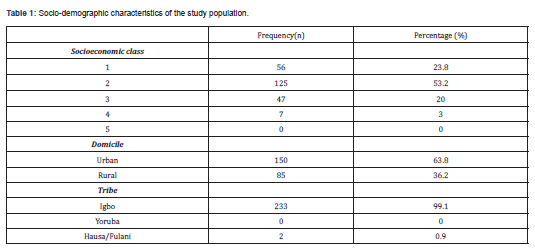 The dominant socio-economic class was class two (53.2%), with 3% and 0% in class four five respectively. Mothers of 150 (63.8%) babies reside in urban areas while mothers of 85 (36.2%) babies reside in rural areas. Majority (99.1%) of the study participants were of the Igbo tribe, while 0.9% were of the Hausa/Fulani tribe (Table 1).
