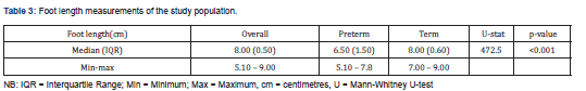 The foot length of the study population ranged from 5.10cm to 9.00cm with a median (IQR) foot length of 8.00cm (0.50). The median (IQR) foot length in the preterm and term subjects were 6.50cm (1.50) and 8.00cm (0.60) respectively (Table 3).