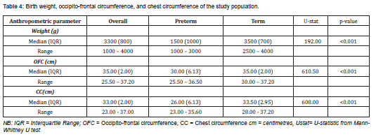 The chest circumference ranged from 23.00–37.00 and the median (IQR) was 33cm (2.00). The median (IQR) chest circumference of 26.00cm (6.13) and 33.5cm (2.95) in the preterm and term subjects respectively also showed statistical significance (p<0.001).