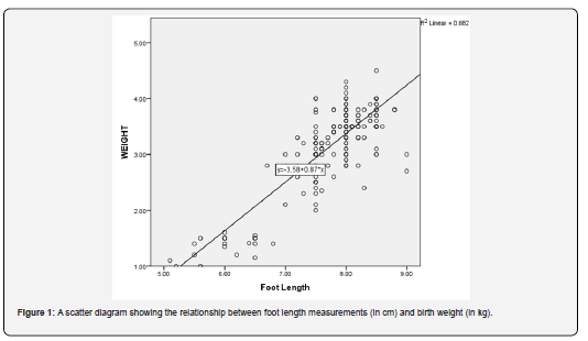 Conclusion: The findings in this study show that foot length is a good proxy for birth weight. Therefore, foot-length measurements can be used in settings where weighing scale and the expertise required for the measurement of other anthropometric parameters are not available to identify high-risk infants who require urgent life-saving interventions.