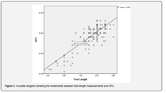 In the setting of the present study, there was a strong positive correlation between foot-length and BW, CC and OFC with OFC having the least correlation. Correlation coefficients were 0.826, 0.783 and 0.801 for BW, CC and OFC respectively [20,21].