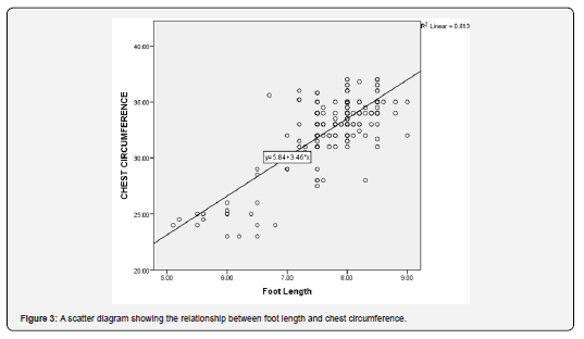 Figure 3 shows a positive significant correlation between foot length and chest circumference (rhos= 0.783, p < 0.001). The scatter plot shows a linear relationship between the two variables (Figure 3) with a coefficient of determination (R2 = 0.613).