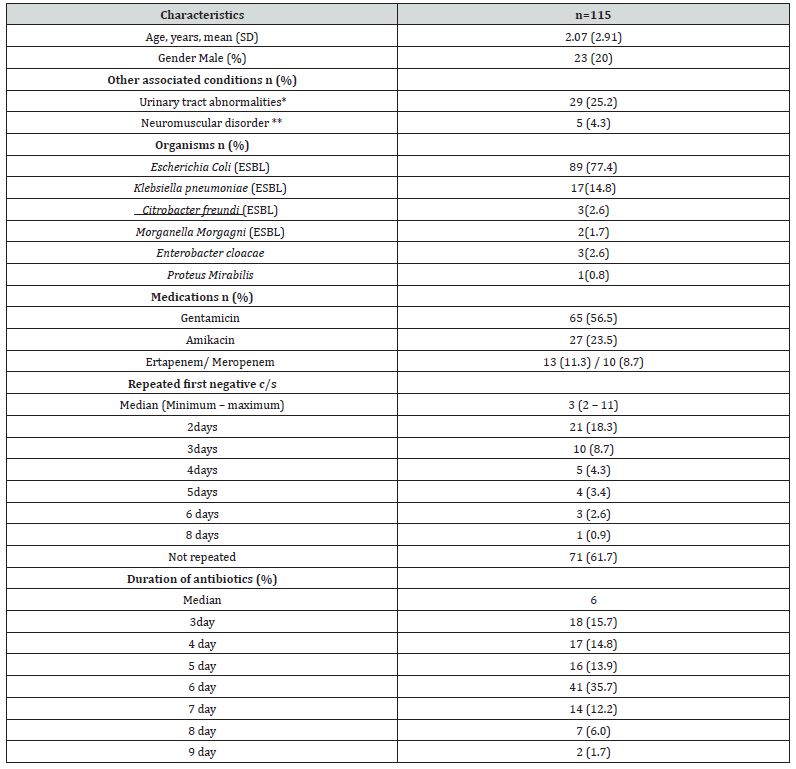 Most of the ESBL organisms isolated were sensitive to carbapenems (100%), Amikacin (98.7%). Gentamicin was used in (56.5%), amikacin (23.5%) and ertapenem/ meropenem (20%). Two cases had 2nd UTI with the same initial bacteria (E-coli and K. Pneumoniae) within one month from treatment and were treated successfully. Fever was identified in 23 cases (26.45%) on presentation, abdominal pain in 21 cases (24.15%), urinary symptoms in 77 cases (67.3%), and poor feeding with irritability especially between infants 8 cases (6.9%). There were (25.21%) of patients known to have urinary tract abnormalities and (4.34%) had neuromuscular disorders. (Table1: Characteristics of a cohort with ESBL urinary tract infection).