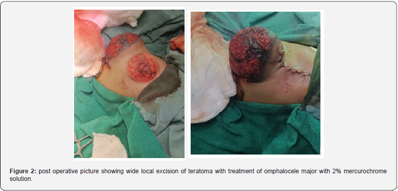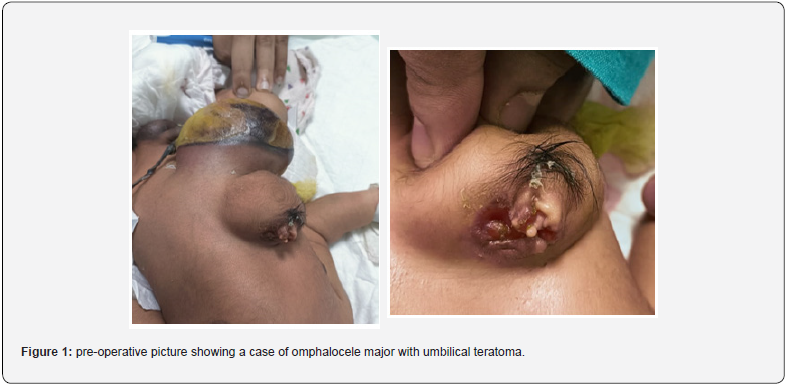 Omphalocele is a congenital malformation of the anterior abdominal wall, which has a central localization and is characterized by the presence of a hernial sac with contents inside. Most often, the contents of the hernial sac are the liver, and loops of the small or large intestine. The incidence of omphalocele varies from 1 in 4,000 to1 in 10,000 [1-3]. In comparison with other malformations of the anterior abdominal wall, omphalocele is often combined with other congenital malformations of the cardiovascular, respiratory or gastrointestinal tracts. Approximately 40% of patients with omphalocele have an abnormal karyotype [4]. Teratoma is a germ cell tumor, which is most often localized in the sacrococcygeal region (89%). Teratomas can be cystic, cystic-solid, or mixed. They can also be found in other areas. Congenital teratomas are most common benign formations, although in recent years there have been reports of early malignancy of the formation. Surgical treatment for small and medium-sized omphalocele without viscero-abdominal imbalance consists of a one-stage reconstruction of the anterior abdominal wall. With a large defect and an insufficient volume of the abdominal cavity, treatment consists in a two-stage immersion of the organs as the volume of the abdominal cavity increases. We describe a clinical case of successful surgical treatment of umbilical cord teratoma in a case of omphalocele major containing liver, small and large intestine as content in Tripura medical college and DR. BRAM teaching hospital.