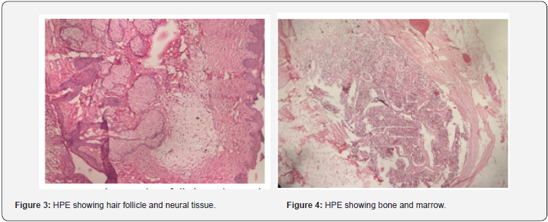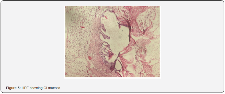 A full-term neonate of uneventful antenatal history presented with two large swellings in umbilical region. There was no other complaint. On physical examination the neonate was pink, active and weighed 2.5 kg. Systemic examination was unremarkable. On local examination, there was a large swelling measuring 8 × 7 cm covered partly by skin and amnion both. A clinical diagnosis of exomphalos major was made. Another swelling measuring 5 cm x 4 cm covered fully by skin with tuft of hair in it. The surface of the swelling was irregular, and the consistency is variegated. A clinical diagnosis of umbilical cord teratoma was made. Apart from routine investigations, X-ray chest and echocardiography were done all of which were within normal limits. Surgical treatment was performed 15 hours after birth following stabilization of the new born’s condition and correction of water electrolyte balance and impaired coagulation. The tumour was surgically removed without disturbing the omphalocele major component. The tumor-like formation was on the external surface of the omphalocele ,5 cm × 4 cm in size with irregular margins along with tuft of hairs and no invasion into adjacent tissues. Inside, a structure of bony-cartilaginous consistency was palpated . Since there was insufficient volume of the abdominal cavity , one-stage plastic surgery of the anterior abdominal wall was not performed. The postoperative period was uneventful. On the third post-operative day there were no signs of inflammation and dehiscence of the surgical wound and it eventually healed by primary intention. The child was discharged on the 11th day after surgery (Figure 1-5).