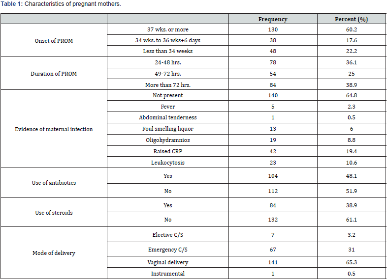 During the study period almost 1972 neonates were admitted to the NICU. Of them, 216 (11%) were included in the study as they met the case definition. Table 1 summarizes the characteristics of the included mothers. Almost two thirds of the cases had PROM at 37 weeks gestational age or beyond that, while in 22% the onset was at less than 34 weeks. It lasted for more than 72 hours in 39% of the cases and less than that in 61%. In most of the included neonates (64.8%), PROM did not cause any signs or symptoms of infection in the mothers. Among those who had raised CRP was the commonest (19.4%), followed by leukocytosis (10.6%) and oligohydramnios (8.8%). Antibiotics and steroids were given to the mothers after PROM in 48% and 39% respectively. The characteristics of the born neonates are shown in Table 2 Most of the included neonates were delivered by vaginal delivery (65.3%) and 31% by emergency cesarean section (C/S). Male gender was seen in 54.6%. Birth weight was 2,500 grams or more in 52.8% and only 0.9% had birth weight less than 1,000 grams. Most of the neonates (59.3%) had gestational age of 38 weeks or more at time of delivery and only 4.2% were less than 30 weeks. Regarding the outcome among the born neonates, two thirds had neonatal complications. These associated complications included prematurity (33.7%), neonatal sepsis (33.3%) and RDS (25.5%).