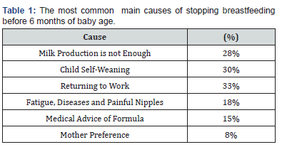 Breast milk is very important for infants and mothers, it has established health, psychological, environmental, and other benefits, including cognitive development, and lowering the risk of infections, cancers, and diabetes in children and mothers [1], it is also considered to be the optimal food that enhances the growth and development of the infants [1,2]. Breastfeeding (BF) should be continued for at least 6 months according to the Canadian Infant Feeding Joint Working Group [3-5]. Despite that many mothers choose to stop breastfeeding before 6 months of age for many reasons such as insufficient milk supply, infant self-weaning, return to studying, school or work and many other issues that related to the obstetrical and neonatal factors, infant age, lifestyle, mother’s education, parity, level of income, stress factors and smoking [6-9]. BF contributes to the good health of mothers and babies as some research demonstrates [10] and so, the World Health Organization (WHO) and international bodies like United International Children Emergency Fund (UNICEF) set several guidelines that recommend and support mothers to breastfeed their babies for the first 6 months of age [11,12].