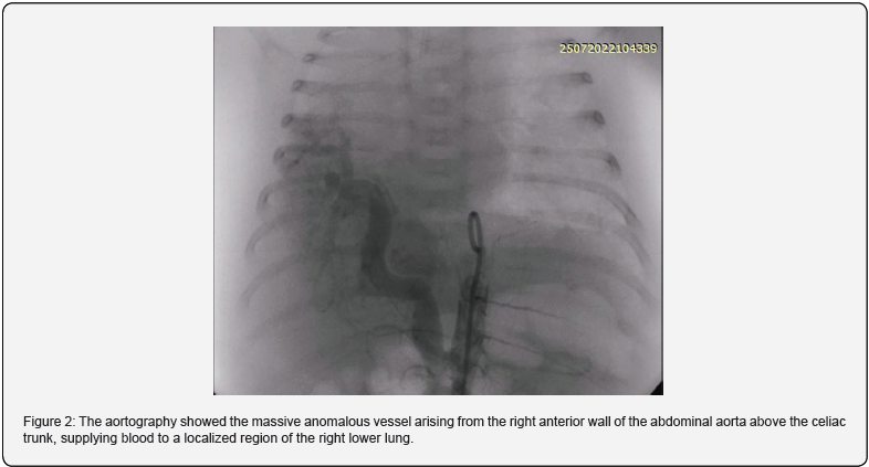 On the 24th day of life, a body weight of 2.8 kg, cardiac catheterization, and angiography via femoral vein and artery with 4-French were performed under general endotracheal an aesthesia. An initial heparin bolus of 100 units/kg was administered. The mean pulmonary artery pressure was 51 mmHg, and the pulmonary to systemic blood flow (Qp/Qs) ratio was 2:1. The right pulmonary artery branch was significantly narrower than the left. Aortography showed the massive anomalous artery arising from the right anterior wall of the abdominal aorta above the celiac trunk, supplying blood to a localized region of the right lower lung (Figure 2). Its narrowest diameter was 4.3 mm; its largest transverse diameter was 6.8 mm, and its length was 19 mm. We selected a device 30% (7 mm) larger than the narrowest artery diameter [Amplatzer Vascular Plug 4]. The device was placed in the second curve via a 4F multipurpose catheter. Control angiography revealed slower flow and low contrast intensity through the deviated blood vessel and the absence of distal translocation of the device. After the procedure, according to the Institutional protocol, a continuous infusion of heparin was prescribed for 24 hours.