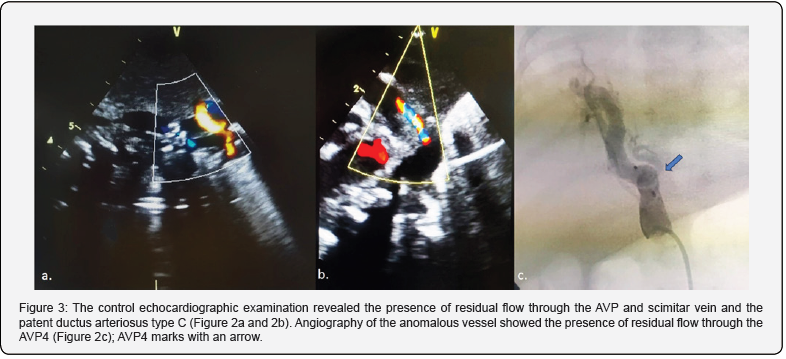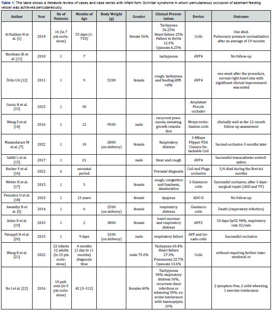 We chose AVP 4, which requires only a 4-Fr diagnostic catheter for delivery [8-10], but the complete embolization was achieved using Cook coils. Bentham et al. presented the first case with an infantile form of Scimitar syndrome using the new AVP 4 for arterial occlusion. At the same time, Örün et al. occluded arterial feeding vessels a year later with the same device [11,12-20]. They performed successful cardiac catheterization in 7- and 9-monthold children. On the other hand, despite successfully feeding vessel occlusion, some literature data showed a high mortality rate of infants with symptomatic Scimitar syndrome, around 40% (Table 1). Wang K et al. presented 22 patients with infant-type Scimitar syndrome and 12 with adult type. In 15 patients, the aortopulmonary collaterals (APC) were occluded percutaneously, and all the patients did not require further interventional or surgical treatment. Still, in their patient’s group, 7 died, 6 had APC, and all had pulmonary hypertension [21-24]. Awasthy N et al. presented a patient who was successfully percutaneously treated but died due to respiratory infection [3].