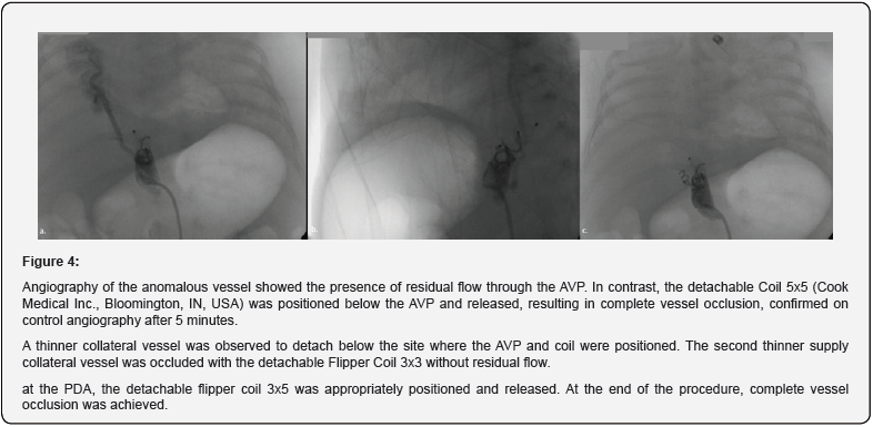 A week after the procedure, the control echocardiography revealed an increased pulmonary blood pressure (peak pressure gradient at the patent ductus arteriosus was 17 mmHg). Residual flow through the AVP and scimitar vein (laminar venous flow) was registered. The PDA type C was 7 mm long, and the pulmonary and aortic ends were 2.8 and 3.5 mm in diameter, respectively (Figure 3 a, b). The PDA and the anomalous artery were closed percutaneously in the second procedure. The procedure was performed with a 4-French sheath and catheters through the right femoral artery. Angiography of the anomalous vessel showed the presence of residual flow through the AVP (Figure 3c), whereas aortography showed that the narrowest diameter of the PDA was 2 mm. The detachable Cook Coil 5x5 was positioned below the AVP and released, resulting in complete vessel occlusion, confirmed on control angiography after 5 minutes. On the other hand, a thinner collateral vessel was observed below the devices (Figure 4a). The second, more delicate supply collateral vessel was occluded with the detachable Flipper Coil 3x3 without residual flow (Figure 4b). The detachable Flipper coil 3x5 was appropriately positioned and released in the PDA. Complete vessel occlusion was executed at the end of the procedure (Figure 4c).