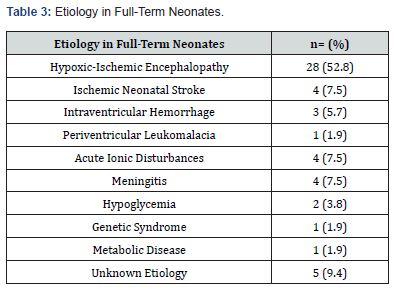 Regarding the preterm group (n=44, 45.4%) (Table 2), seizures were attributed to periventricular-intraventricular hemorrhage in 19 patients (43.2%), periventricular leukomalacia in 8 (18.2%), venous infarction with secondary hemorrhage in 3 (6.8%), and other causes in 14 (31.8%). The other etiologies included meningitis (n= 3, 6.8%), congenital brain malformations (n=2, 4.5%), genetic syndromes (n=2, 4.5%), and acute ionic disturbances (n=2, 4.5%). Additionally, five patients (11.5%) had an unknown etiology. The brain malformation identified in both patients was polymicrogyria. Among those with a genetic etiology, one newborn was diagnosed with Ohtahara syndrome, while the other had Cardiofaciocutaneous syndrome caused by a MAP2K1 pathogenic variant.