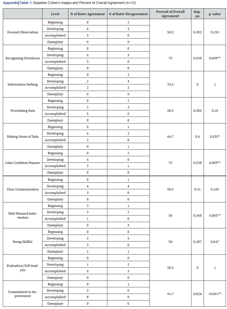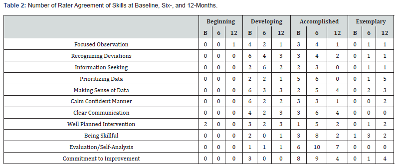 Few ratings of exemplary were provided at baseline with the following exceptions: “information seeking” (8.3% for one rater), “making sense of data” (8.3% for one rater), “well planned intervention” (25.0% for one rater), and “being skillful” (16.7% for one rater and 8.3% for the other). Exemplary and accomplished percentages were then averaged between the two raters. Skills with the three highest average percentages of exemplary and accomplished at baseline were “evaluation/self-analysis” (35.4%), “commitment to improvement” (33.3%), and “being skillful” (31.3%). The lowest three were “focused observation”, “recognizing deviations”, and “calm confident manner” (all 14.6%).