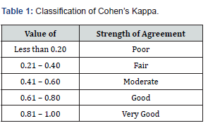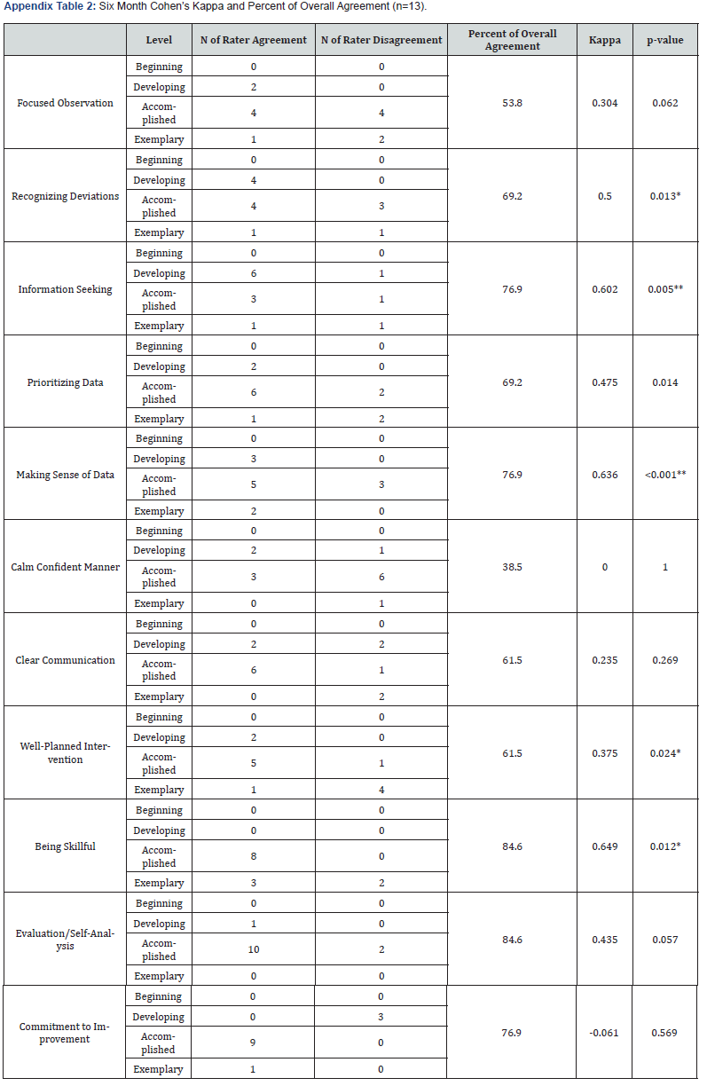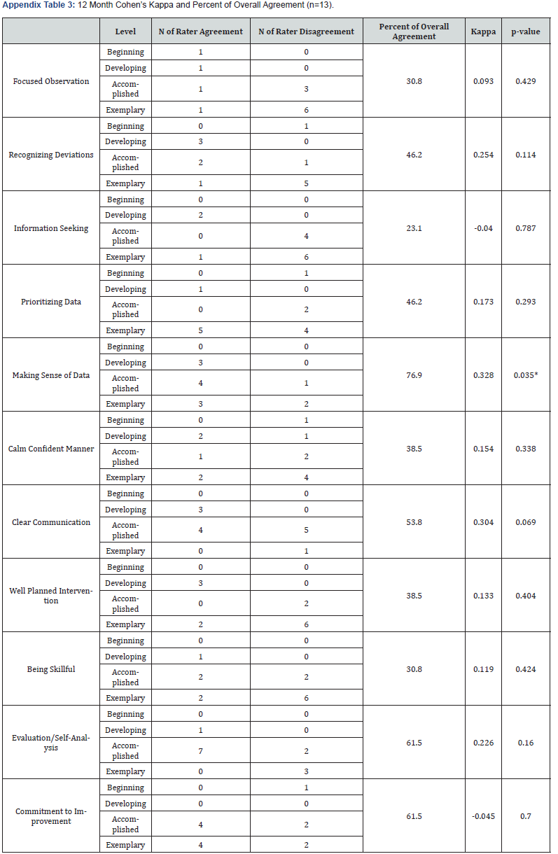 Two raters utilized the LCJR to determine the participants’ proficiencies in four areas at three intervals. Cohen’s Kappa (K) was used to examine inter-rater reliability. The classification of Cohen’s Kappa is presented in Table 1. There were 13 participants at baseline; all participants performed the six- and 12-month simulation exercises with zero attrition. At baseline, five of the 11 ratings (45.5%) between the raters were significant at either the 0.01 or 0.05 levels (see Appendix for detailed tables of all three time periods). The highest K was 0.824 for “commitment to improvement.” All 13 participants were present for the six-month simulation exercises. Six of the 11 ratings were significant (54.5%) at the 0.01 or 0.05 levels. The highest K was 0.649 for “being skillful,” and the K for “commitment to improvement” dropped to -0.061. For the 12-month exercises, one of the K results (0.328 for “making sense of data”) was significant (9.0%), p = .035. The largest agreed-upon gain in skills over time was for “prioritizing data,” with the raters agreeing on five of the participants displaying exemplary skills; this area was followed by “commitment to improvement”. There appeared to be a slight degradation of skills for “focused observation,” as the raters agreed on a beginning level for one participant at 12 months when there was no agreement on a beginning level at baseline or six months. Agreement on the demonstration of developing or accomplished skills also decreased at 12 months for “focused observation” (Table 2).