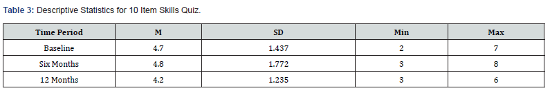 The participants took a ten-item resuscitation focused knowledge quiz at baseline, six months, and 12 months. Mean scores increased slightly at six months (4.7 to 4.8) and decreased slightly at 12 months (4.8 to 4.2) (Table 3). Given the small sample size and lack of normality, the nonparametric Related Samples Kendall’s Coefficient of Concordance was conducted; the results were not significant (Kendall’s W = 0.016, p = 0.811).