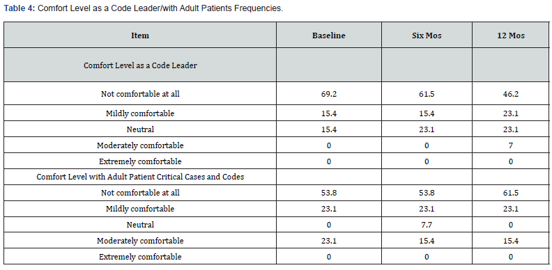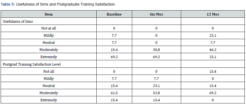 Participants reflected on the confidence they had in their abilities before taking part in the simulation. Respondents evaluated their comfort as a code leader and their comfort levels with adult patient critical cases and codes using a rating scale of extremely comfortable, moderately comfortable, neutral, mildly comfortable, and not comfortable at all. For comfort level as a code leader, approximately two-thirds of the participants did not feel comfortable at all. This comfort level decreased to under half at 12 months. Comfort level with adult patient critical cases and codes decreased somewhat at 12 months. No participant indicated feeling extremely comfortable at any point for either question (Table 4). The usefulness of simulations and the postgraduate training satisfaction levels were rated as not at all, mildly, neutral, moderately, and extremely. Participants endorsed simulations as being more useful at six months (where 100% rated them as moderately or extremely useful) than at either baseline or 12 months. Satisfaction with the postgraduate training decreased after six months (Table 5).