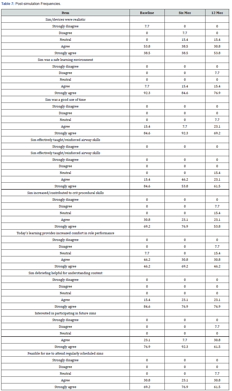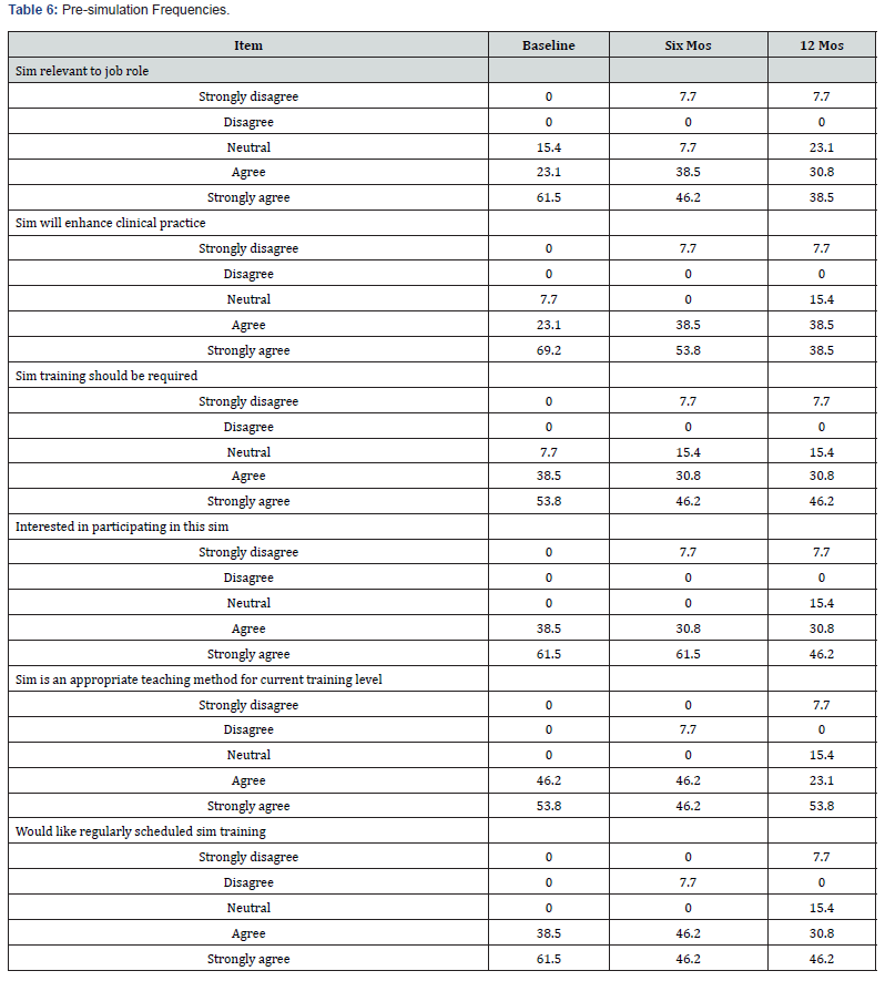 Participants responded to a questionnaire regarding simulations after completing them. The ratings for the postsimulation questions were strongly disagree, disagree, neutral, agree, and strongly agree. Agreement scores were found to degrade slightly toward twelve months overall (Table 7).