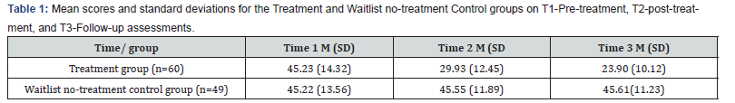 ANOVA analyses showed a significant main effect of time, F (2,196) = 147.87, p <.001, η2 = 0.60. This indicates that PTSD scores significantly changed over the three points. A significant main effect of group was also found, F (1,98) =12.34, p = .001, η2 = 0.11. The treatment group showed greater reductions in PTSD scores compared to the control group. An interaction effect (time × group) was observed, F (2,196) = 45.67, p <.001, η2=0.32, confirming that the changes in PTSD scores over time differed between the treatment and control groups. Mean comparisons between groups were calculated through independent samples t-tests. Results showed no significant difference between the treatment group (M = 45.23, SD = 14.32) and the waitlist control group (M = 45.22, SD = 13.56) at pre-treatment, t (107) = 0.004, p = .997, Cohen’s d = 0.001. There was a significant difference between the treatment group (M = 29.93, SD = 12.45) and the waitlist control group (M= 45.55, SD = 11.89) at post-treatment, t (107) = −6.73, p < .001, Cohen’s d = −1.28 and there was a significant difference between the treatment group (M = 23.90, SD = 10.12) and the waitlist control group (M= 45.61, SD = 11.23) at follow-up, t (107) = −10.70, p < .001, Cohen’s d = −2.04. Mean comparisons within groups showed a statistically significant decrease for the treatment group comparing scores from pretreatment (M = 45.23, SD = 14.32) to post-treatment (M = 29.93, SD = 12.45), t (59) = 10.34, p < .001, Cohen’s d = 1.14. There was a statistically significant decrease from post-treatment (M = 29.93, SD = 12.45) to follow-up (M = 23.90, SD = 10.12), t (59) = 4.94, p < .001, Cohen’s d = 0.53. There was a statistically significant decrease from pre-treatment (M = 45.23, SD = 14.32) to followup (M = 23.90, SD = 10.12), t (59) = 13.25, p < .001, Cohen’s d = 1.72. Within t-test for the waitlist control group demonstrated that there was no significant change from Time 1 (M = 45.22, SD = 13.56) to Time 2 (M = 45.55, SD = 11.89), t (48) = −0.22, p = .830, Cohen’s d = −0.03. There was no significant change from Time 2 (M = 45.55, SD = 11.89) to Time 3 (M = 45.61, SD = 11.23), t (48) = −0.05, p = .962, Cohen’s d = −0.01 and there was no significant change from Time 1 (M = 45.22, SD = 13.56) to Time 3 (M = 45.61, SD = 11.23), t (48) = −0.28, p = .778, Cohen’s d = −0.04. (Table 1, Figure 2)