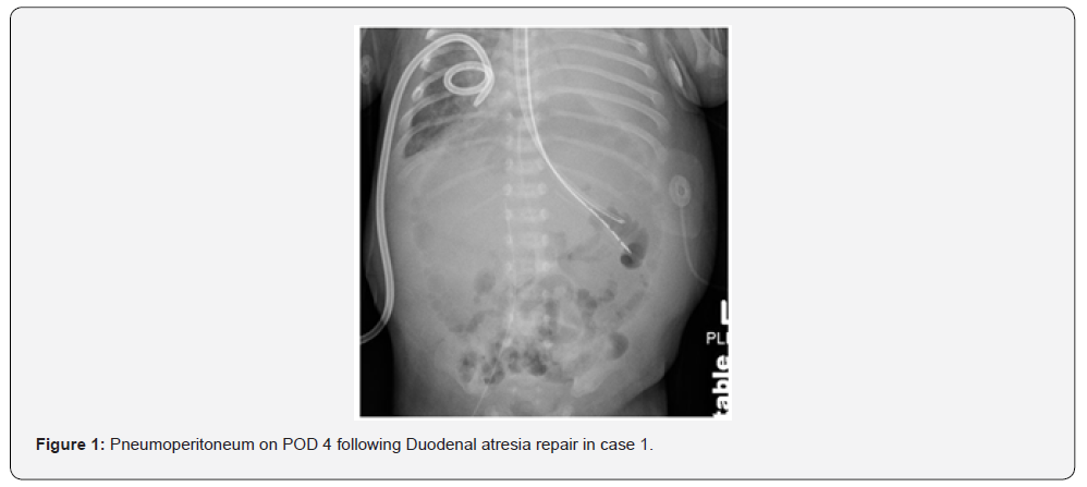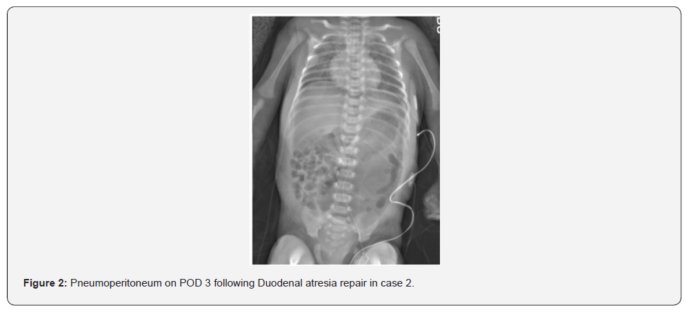 Case Presentation: The first neonate was born preterm at 31 weeks gestation with Trisomy 21, complete atrioventricular septal defect (AVSD), and duodenal atresia. He was intubated for DA repair and was extubated and placed on noninvasive neurally adjusted ventilatory assist (NI-NAVA) on postoperative day two. On postoperative day four, he developed abdominal distention and hypoxemia. Abdominal imaging showed a pneumoperitoneum. Exploratory laparotomy was performed to repair a leak at the anastomotic site. The second case was a term infant with duodenal atresia, myelomeningocele, and other dysmorphic features. She was extubated to high flow nasal cannula on the post-operative day three. Due to increasing respiratory distress, support was escalated to continuous positive airway pressure (CPAP) and then to noninvasive positive pressure ventilation (NIPPV) within a few hours. Increasing abdominal distention led to imaging and showed a pneumoperitoneum. A leak at the anastomotic site was identified and repaired.