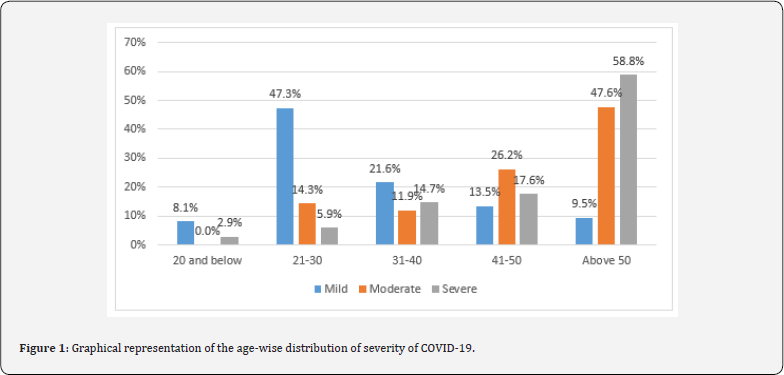 The age of patients ranged from 18 to 60 years with a mean age of 40.48 years. Severity of the disease was more seen in patients above 50 years [20 cases (58.8%)] and was least severe in age below 18 years [1 case (2.9%)] as shown in (Figure 1).