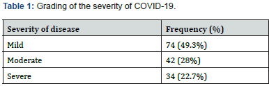 With respect to the clinical history of the patients, the maximum number (74 cases, 49.3%) were mild, followed by moderate (42 cases, 28.0%) and severe (34 cases, 22.7%) as shown in Table 1.