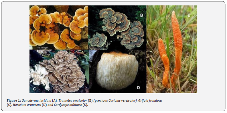 Almost unknown in Western Scientific Research only three decades ago, some of the wood degrading Basidiomycetes became intensely and systematically studied due to their promising pharmacological effects (Figures 1 A-E). Among them, Ganoderma lucidum-Ling zhi or Reishi, Grifola frondosa-Maitake, Hericium erinaceus-Lion mane and Cordyceps militaris have been known from the traditional Asian medicine, and Trametes versicolor Turkey tale, (previous Coriolus versicolor) are the subject of this review.