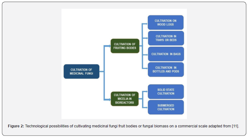 Since medicinal mushrooms are scarce in nature, cultivation of fruit bodies on artificial media has been introduced. Traditional cultivation of fruit bodies on wood logs has been known for centuries. With time, cultivation methods have diversified, modified and developed (Figure 2) [11].