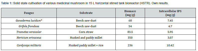 Besides the cultures present in this chapter, there are also some other medicinal mushrooms that were submerge cultivated in mostly in lab scale bioreactors. Inonotus levis and Agaricus nevoi cultivation was proceed in a 10 L stirred-tank bioreactor using substrate based on glucose and corn steep liquor at pH 5.5. Agitation speed gradually increased from 50 to 300 rpm and T 28°C. I. levis developed very rapidly and after 5 days of cultivation the culture reached the stationary phase of growth with a high level of mycelia biomass of 16 g/L at level of EPS concentration 4.2 g/L. A. nevoi was distinguished by a much lower growth rate and entered the stationary growth phase on day 10 with mushroom biomass 12 g/L and EPS of 3.9 g/L [101].