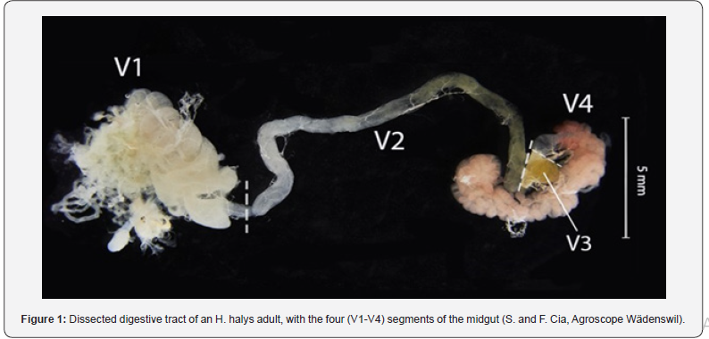 Prior to dissection, H. halys adult were kept at 4°C for at least 2 hours to immobilize the insects. Thereafter their head and legs were cut off with a sterile scalpel and the remaining body part was transferred on a sterile plate. The plate was placed in a UVCrosslinker (Vilber Lourmat UV-Crosslinker BLX-E254 6111 2081 1) for surface sterilization, and both insect’s ventral and dorsal body sides were each UV treated at 100V ~ 50 Hz for 30 seconds. The gut dissection was then performed under a dissection microscope. The abdomen was opened by cutting ventral alongside the tracheal openings with a sterile scalpel. Subsequently the dorsal part was lifted using sterile forceps. Immediately after opening, a few drops of 1x phosphate-buffered saline (PBS: 8 g/l NaCl, 0.2 g/l KCl, 1.44 g/l Na2HPO4, 0.24 g/l KH2PO4, pH 7,4) were pipetted onto the organs. The digestive tracts (including fore-, mid-, and hind guts but without the Malpighian tubes, Figure 1) were entirely removed and rinsed twice with PBS before being transferred into a 2 ml Eppendorf tube containing 500 μl PBS. The tubes were then kept at 4 °C until homogenization.