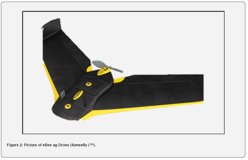 At the booting stage of the rice crop, low-altitude aerial surveys were conducted for zones H, I, and J (Figure 1b) as distinct units. The flight boundaries were established using field coordinates obtained from the initial ground GPS mapping. These coordinates were imported into eMotion, a SenseFly software [44], to generate autonomous flight plans for an eBee ag (Figure 2), a cost-effective agricultural drone. The eBee offers fully autonomous flight capabilities, from takeoff to landing, and is controlled via a user-friendly ground control software that allows for mission planning and real-time monitoring. This drone offers an extended flight time of up to 55 minutes and 160 hectares / 395 acres coverage. Two multispectral sensors were used, the Sequoia and the Sensor Optimized for Drone Applications (SODA). The Sequoia sensor captured images in the following four distinct bands: green (530-5570 nm), red (640-680 nm), near-infrared (800-880 nm), and red edge (710-740 nm). It also has an embedded 16 MP red (640-680), green (530-5570 nm) blue (450- 500) The SODA camera captured the red (640-680), green (530- 5570 nm), and blue (450-500) bands.