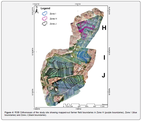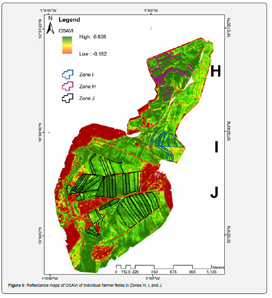 The RGB Orthomosaics for zones H, I, and J were created using imagery captured on the UAS platform. GPS coor-dinates marking field boundary points were employed to outline farmer fields in each zone (Figure 4). These true-color images are powerful tools that offer detailed, accurate, and easily interpretable information about rice fields. High spatial resolution, geo-referencing, and uniform scales enable precise measurements and analysis. Reflectance maps derived from orthomosaics for NDVI and OSAVI are illustrated in (Figures 5 and 6), respectively.