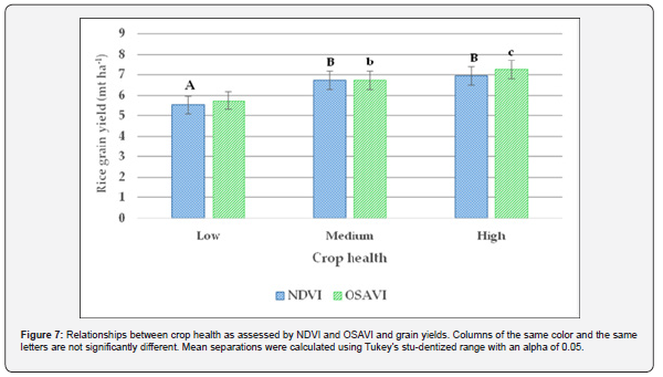 Figure 7 shows the relationships between the designated midseason crop health as a function of NDVI and OSAVI and the final rice grain yield obtained at the end of the season. There was a linear increase in yield from low (OSAVI 0.544) to high (OSAVI 0.685) health as assessed by OSAVI. On the other hand, no statistically significant differences in rice yields were observed between the medium (NDVI 0.874) and high (NDVI 0.874) crop health zones based on NDVI. However, medium and high-health zones had significantly higher yields than low (NDVI 0.725)-health zones.
