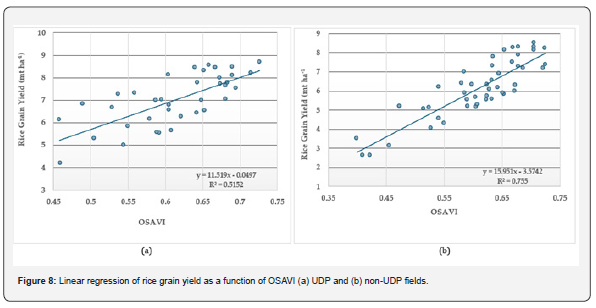 The predictive equations for UDP and non-UDP fields are presented in (Figures 7a and 7b), respectively. These equations reveal that OSAVI significantly predicts grain yield for UDP and non-UDP conditions, though the impact and the models’ predictive power differs. The equations suggest that OSAVI significantly predicts rice grain yield, with 51.5% of the variability explained for UDP and 75.5% for non-UDP.