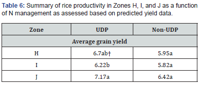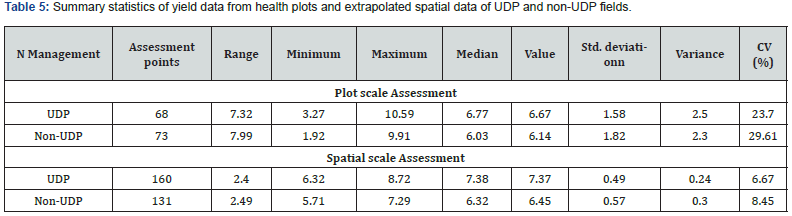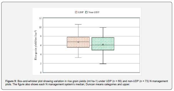 On UDP plots, grain yields ranged from a minimum of 3.27 to a maximum of 10.59 mt ha-1 with a range of 7.32 mt ha-1 but narrowed to a minimum yield of 6.32 to a maximum of 8.72mt ha-1, a range of 2.4 mt ha-1 at the spatial scale. Grain yield from UDP plots exceeded their non-UDP counterparts by 0.69%, and at the field scale, UDP outperformed non-UDP by 0.84%. Similar relationships were obtained by [78,79] in their rice yield-N placement strategies investigations in Northern Ghana and Southern Bangladesh, respectively.