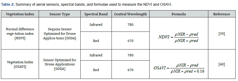 The eBee Ag drone, coupled with the Sequoia camera, was flown at 127.4 meters above elevation data (AED), with a 60% fore lap and 80% lateral overlap, resulting in a 12.0 cm/pixel ground resolution. The same eBee was flown with the SODA camera at 74.3 meters with 65% forelap and 70% side-lap to achieve a 7.0 cm/ pixel. The initial image processing phase involved the eMotion 3 software [44]. This software facilitated georeferencing, alignment, and stitching of images by identifying tie points in overlapping images. Subsequently, the processed data were transferred to Pix4D, where the Standard Ag multispectral processing option was employed to generate seamless high-resolution orthomosaics for Zones H, I, and J, as depicted in (Figure 3). Two vegetation indices, NDVI and OSAVI, were computed, and their respective formulas and references are provided in (Table 2). Reflectance imagery was produced for the two vegetation indices.