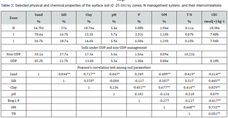 The upper layer of soil (0 - 25 cm) displays a prevalent sandy loam texture. Zone H exhibits the highest clay con-tent at 18.76% (Table 3). In contrast, Zone I shows the highest sand content at 70.6%, a considerably more significant proportion compared to zones H and J. Across all zones, the soil demonstrates acidity. While there is no notable difference in pH levels between zones, there is a slight increase from 5.4 in Zone H to 5.9 in Zone J. Zone H inherently has higher fertility levels than Zones I and J, as evidenced by elevated levels of organic matter (OM), total N, and cation exchange capacity (CEC). Particularly noteworthy is Zone J, which exhibits significantly higher concentrations of plant-available P, measuring 6.58 mg kg-1, in contrast to 5.08 mg kg-1 and 2.32 mg kg-1 in Zones I and H, respectively.