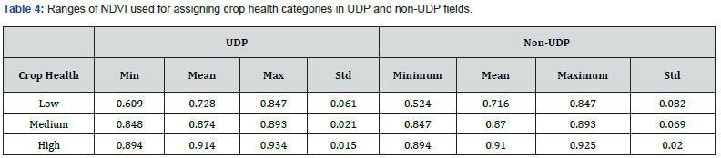 The NDVI values used to define crop health categories in UDP and non-UDP fields are presented in (Table 4). These are based on reflectance values obtained from UAS data collected at the booting stage of the rice crop, as shown in (Figure 5).