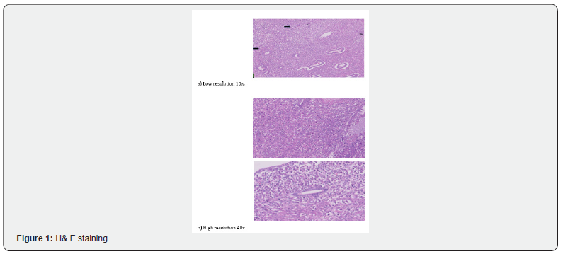 Cervix: erosion, cervical wall showed a fibroid measuring 1.3cm. The right and left ovaries measured 1.5 × 1.5 × 1cm and 2 × 1.5 × 1cm, respectively, with congested external surfaces. Both fallopian tubes measured 3 cm in length, with normal caliber on cut section. Bilateral parametrial tissues were unremarkable.