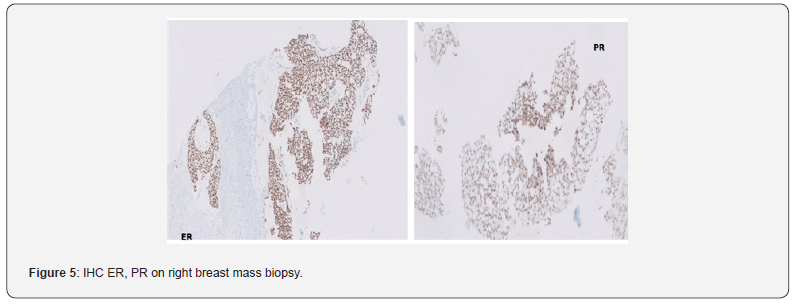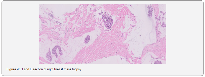 Imaging studies: Subsequent whole-body PET-CT demonstrated a metabolically active lesion in the right breast along with nodal and skeletal metastases, suggestive of disseminated malignancy. Also noted was an irregular intensity lesion in the left breast, which was also FDG avid consequently a right breast mass biopsy was performed.