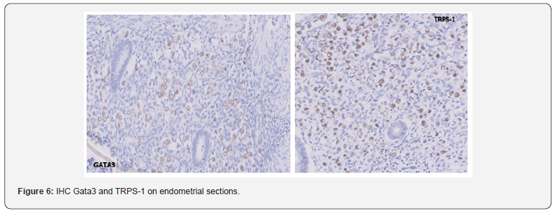Like ILC in the breast, metastatic ILC tends to infiltrate the affected organs in a diffuse process instead of forming a discrete tumor nodule [9]. The overlapping morphologic features of the background endometrial stromal cells with the single cell and sheet-like proliferation of the metastatic tumor cells was a major diagnostic challenge in our case, especially that both cell types are likely to demonstrate positivity for hormone receptors. However, the positivity for breast origin sensitive markers like GATA3 and TRPS-1, in the tumor cells, along with the clinical backdrop, helped in reaching the correct diagnosis.