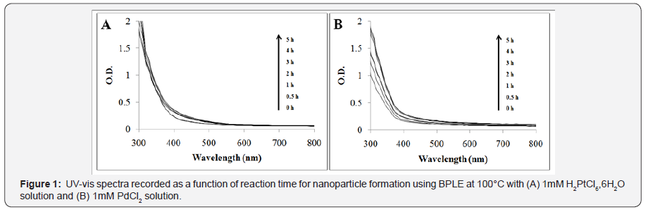 PtCl6 2- ions were reduced by addition of 5 mL of BPLE to 95 mL of 10-3M aqueous H2PtCl6, 6H2O solution. Similarly, PdNPs were synthesized by addition of 5 mL of BPLE to 95 mL of 10- 3M aqueous PdCl2. Synthesis of PtNPs and PdNPs were achieved by carrying out the reaction at 100°C for 5 hours which was monitored by UV-Vis spectroscopy on a spectrophotometer (Spectra Max M5, Molecular Devices Corp, USA) operated at resolution of 1 nm.