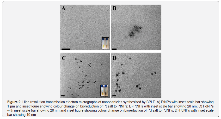 This relatively low rate of synthesis can probably be attributed to difficulty in initial stages of nuclei formation, which reflects in longer reaction time and higher temperature for achieving 100% conversion of metal salt to respective nanoparticles [39]. Our results are well in agreement with the previous report where PtNPs synthesized by Persimmon leaf broth were smaller in shape ranging from 2-20 nm and spherical in shape [39]. The average particle size of the PtNPs synthesized using BPLE were found to be between 1 to 2 nm which is very close to the PtNPs formed using D. kaki leaf broth (5 nm at 95°C). Higher temperature might play a key role in controlling size as it facilitates very rapid nuclei formation by most of the metal ions limiting the secondary reduction on the surface of preformed nuclei [23,40].