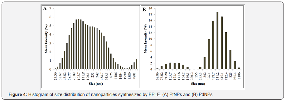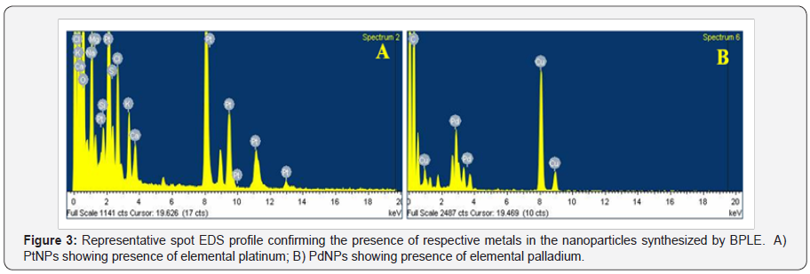 PtNPs and PdNPs bioreduced by BPLE was analysed for size and shape using HRTEM. PtNPs were found to be very small ranging between 1 to 2 nm (Figure 2A). The particles were monodispersed and uniformly distributed over the surface of the grid (Figure 2B). Agglomeration was not observed indicating the stability of the particles. PdNPs were spherical to irregular in shape (Figure 2C). The particles were very small ranging from 5to7 nm and well dispersed (Figure 2D). EDS spectra confirmed the presence of elemental platinum and palladium in the PtNPs and PdNPs, respectively (Figure 3A & 3B). Particle size distribution recorded using dynamic light scattering for PtNPs and PdNPs synthesized using BPLE was found to be well in agreement with the HRTEM results (Figure 4A & 4B).