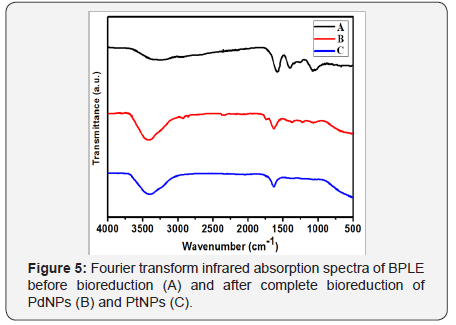 In order to understand the mechanism behind the bioreduction of the metal ions to their corresponding nanoparticles FTIR analysis was performed which showed that BPLE plays an important role. It reduced the metal salts to their respective nanoparticles and stabilizing them as well. This could be confirmed from the FTIR spectra of the BPLE before and after reduction of the nanoparticles. The FTIR spectra of the BPLE, before (Figure 5A) and after reduction of the salts Pd (Figure 5B) and Pt (Figure 5C), respectively, were recorded. Few characteristic peaks of the BPLE were noticed to be intact while few showed shift/disappearance, after the reduction of metal salts. This shift/disappearance can be due to the interaction of the corresponding functional group with the metal salt, and their role in stabilizing the nanoparticles. The broad peak at ~ 3276 cm-1 indicated the hydroxyl (-OH) group of polyphenols/alcohol. The peak at 1396 cm-1 diminished which represents (NO3-) or (symmetric CH3 bending of proteins), indicating their active role in reducing the metal salt. Similarly, the peak at 1249 cm-1 got reduced which represents C-S bond which might be utilized in nanoparticles formation.