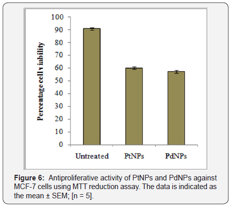 Both PtNPs and PdNPs synthesized by BPLE were checked for antiproliferative activity against MCF-7 cells using MTT dye reduction assay. 48hours of incubation exhibited significant reduction of the cell viability as compared to the untreated control. On treatment with PtNPs, MCF-7 cells showed 60.08±2.4 % viability while treatment with PdNPs showed 57.22±1.68 % viability (Figure 6). Hereby, PdNPs were found to be superior anticancer agents as compared to PtNPs as they efficiently inhibited the proliferation of MCF-7 cells.