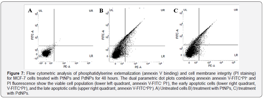 Flow cytometric analysis was carried on to evaluate the induction of apoptosis in presence of PtNPs and PdNPs synthesized by BPLE. Dual staining with annexin V-FITC and propidium iodide indicated externalization of phosphatidylserine and loss of cell membrane integrity, respectively. Compared to control MCF-7 cells treated with PtNPs after 48 hours showed 21.48 % of population were annexin V-FITC+PI+ indicating induction of apoptosis (Figure 7A & B). Similarly, the dual parametric dot plots combining annexin V-FITC and PI fluorescence in MCF- 7cells treated with PdNPs after 48hours showed 20.36% of population were annexin V-FITC+PI+ (Figure 7C). These results confirmed that the mechanism behind antiproliferative activity of the bio reduced PtNPs and PdNPs was apoptosis.
