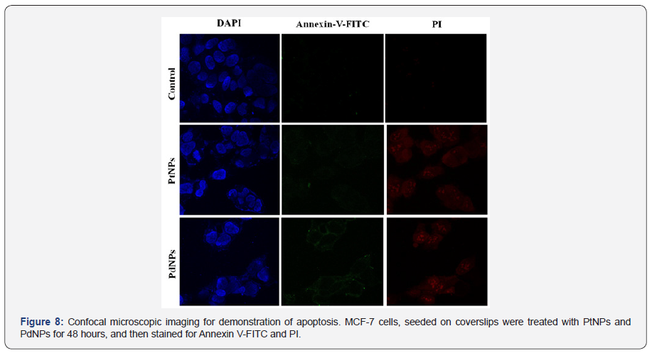 Mechanism behind the anticancer activity of bioreduced PtNPs and PdNPs against MCF-7cell lines was further confirmed using confocal microscopy (Figure 8). Confocal micrographs of the cells treated with PtNPs and PdNPs revealed valuable indications about induction of apoptosis. In case of the untreated control only DAPI was visible while on treatment with PtNPs annexin V-FITC+PI+ MCF-7 cells were visualized. However, the intensity of FITC was significantly low indicating slow induction of apoptosis. In case of PdNPs treated annexin V-FITC+PI+ MCF- 7 cells, the intensity of both FITC and PI were high indicating maximum cells were in late apoptotic stage.
