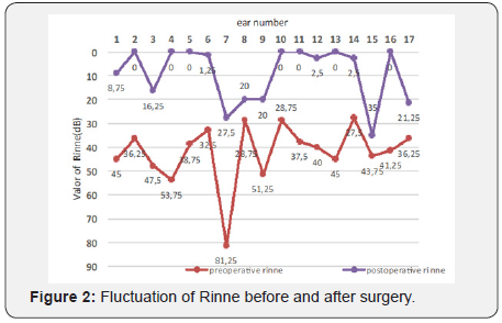 ii. Post-operative Rinne average: The mean postoperative Rinne ranged from 0 to 35dB with an average of 9.11dB. The average Rinne gain ranged from 8.75 to 53.75dB with an average of 32.94dB (Figure 2)