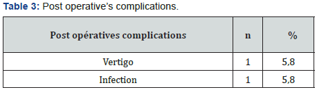 The mean audiometric Rinne had increased from 42.05dB before the operation to 9.11dB after surgery whether an average gain of 39.94dB in Rinne. This gain the highest compared to the literature (Table 5). This could be explained by our very high average preoperative Rinne, related to the delay of diagnosis. The diagnosis is made at an advanced stage of deafness, 5 years after the beginning of hearing discomfort. The postoperative Rinne was ≤20dB in 82.3% of cases. This success rate is like that reported by RIOS [25] in Spain, MAHAFZA in Jordan [10], and SOUZA in Brazil [26] who found a POR ≤20 dB in 84.21%, 85.6% and 95.1% of cases. The functional hearing results in black are like those of the literature and are generally satisfactory.