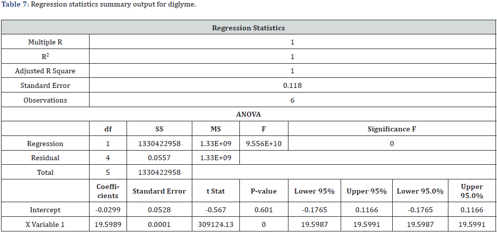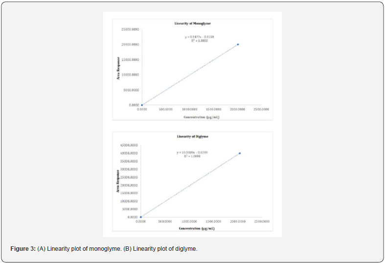 The linearity of the method was established by analyzing serially diluting solutions containing both monoglyme and diglyme at the starting level of LOQ and several times the strength of the standard solution (i.e., 200000%) [16,17]. The linearity solutions were prepared at the LOQ level of 40%, 50%, 100%, 150%, and 200000% of the sample strength. The LOQ and 200000% solutions were injected six times and the other linearity solutions were injected twice into the chromatograph. A correlation coefficient of 1.0000 was obtained for both monoglyme and diglyme, higher than the 0.98 limits for the correlation coefficient [16,17]. The range was calculated from the linearity data of the LOQ and 200000% solutions that represented the lower and upper levels of sample strength. The specified concentration range (0.03 - 2000μg/mL) for both monoglyme and diglyme is presented in Table 5. The technique was found to be linear, and the range was consistent with the ICH guidelines Q2 (R1) and USP [16,17]. The regression statistics summary output showed that the regression model cannot be rejected. The obtained real values Table 6&7 passed close to but not exactly through the origin. The linearity graph for both monoglyme and diglyme is shown in figure 3.