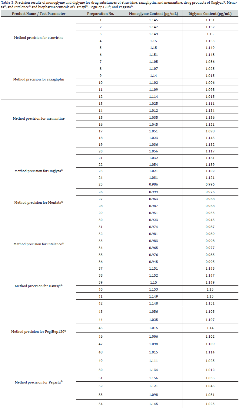 The accuracy of the technique was established using the tolerance sample solutions. The accuracy of the method was evaluated at the lowest, specification, and highest levels of LOQ, 100%, and 150%, respectively. The required recovery value limit is between 80% and 120%. Each LOQ, 100%, and 150% levels tolerance sample solutions were prepared in triplicate to prove the accuracy of the method. These solutions were injected once into the chromatograph, and the recovery value of monoglyme and diglyme in drug substances of saxagliptin, memantine, etravirine, drug products of saxagliptin tablets (Onglyza®), memantine tablets (Menata®), etravirine tablets (Intelence®), and biopharmaceuticals of Pegaspargase Injection (Hamsyl®), PEGinterferon Injection (PegiHep120®), and Pegfilgastim Injection (Pegasta®) were calculated. The obtained values 85% - 108% were within the acceptable limits. The results are shown in table 8.